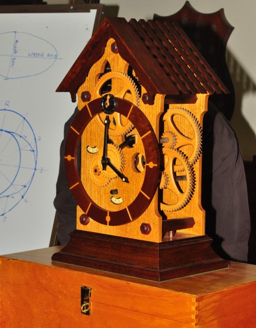 his magnificent clock with its intricate wooden gear system.